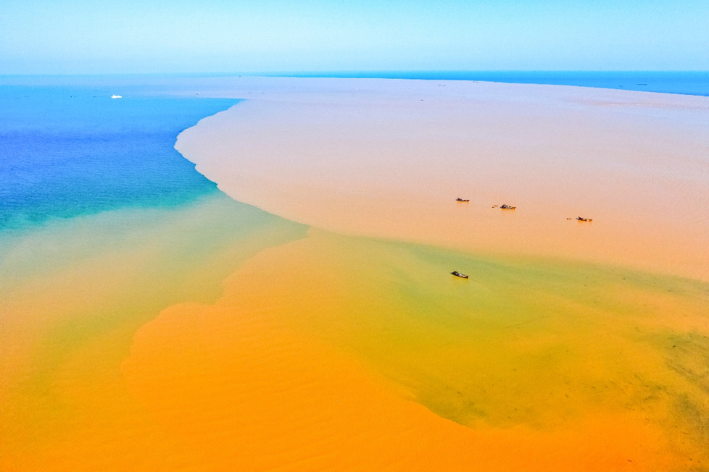 来到山东东营,不可错过的非凡景象就是黄河入海口的黄蓝交汇。在这里,雄浑的黄河与蔚蓝的大海相遇,造就了“河海交汇”的旷世奇景美,坐着黄河游船抵达分界线,裹挟着大量泥沙的黄河在一瞬间仿佛被海水封印住一般,黄河和大海泾渭分明。