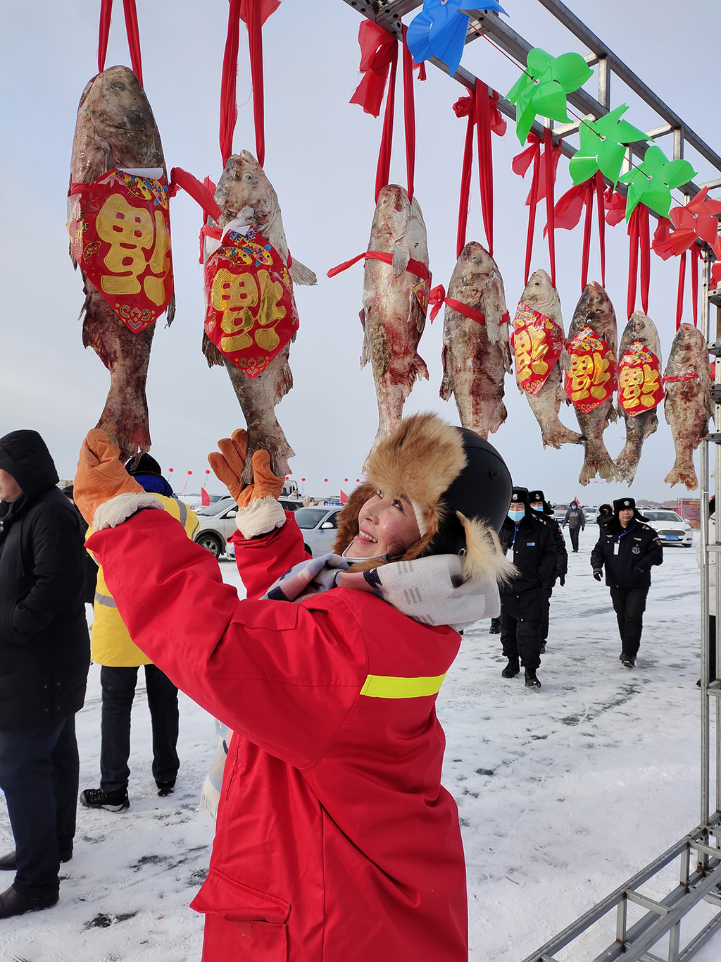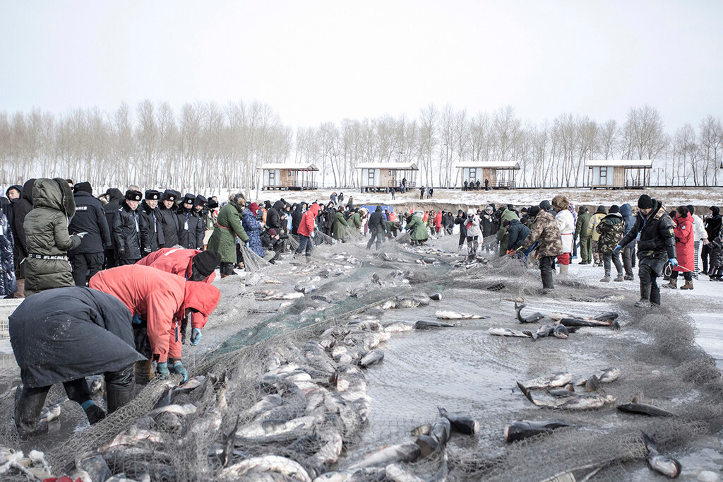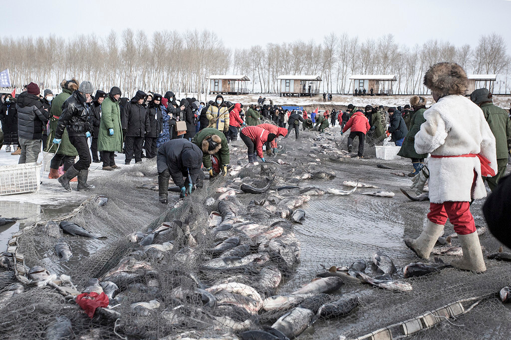 一系列祭湖醒网的仪式结束后,大家来到了最南侧,第一时间观看冬捕。听说往年冬捕上来的第一条鱼是进行拍卖的,但今年好想暂停了这项活动,硕大的鱼随着渔网来到了冰面上,渔民们一直在拉网、装鱼,听说今年第一天冬捕收获的鱼足足有17万斤。
