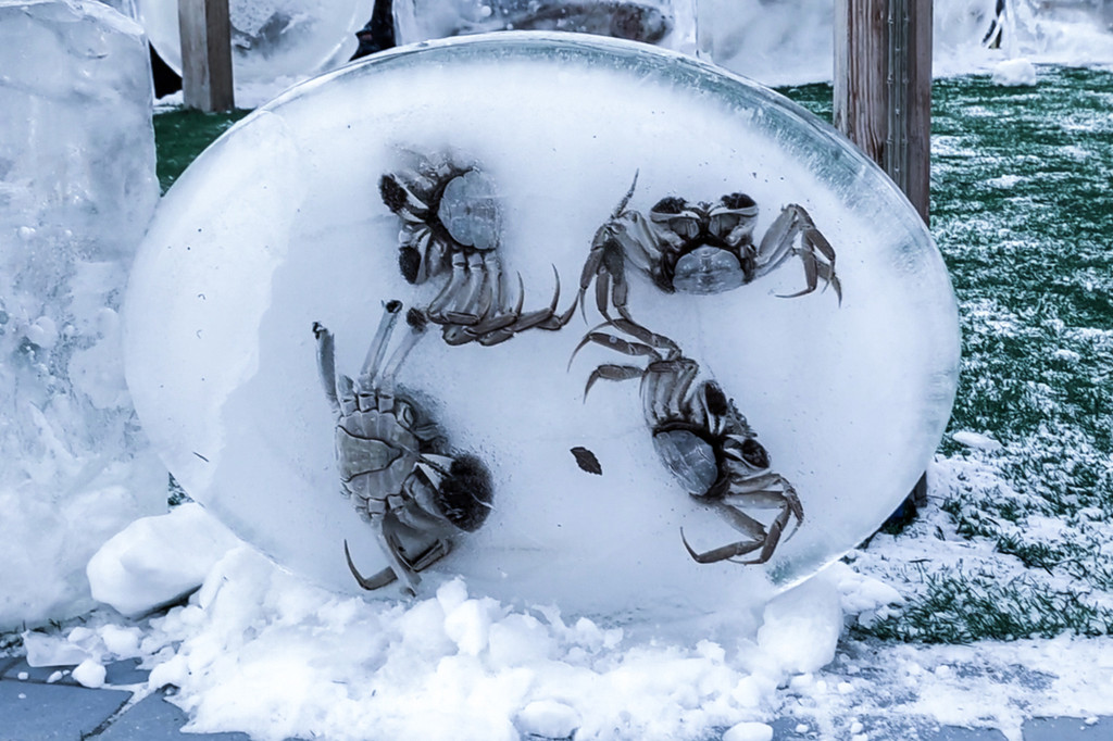 东北人也是第一次看到这样的画面,螃蟹、鱼、冻在了冰里,不知道是为了保鲜,还是当作一种景观,挺有趣的。