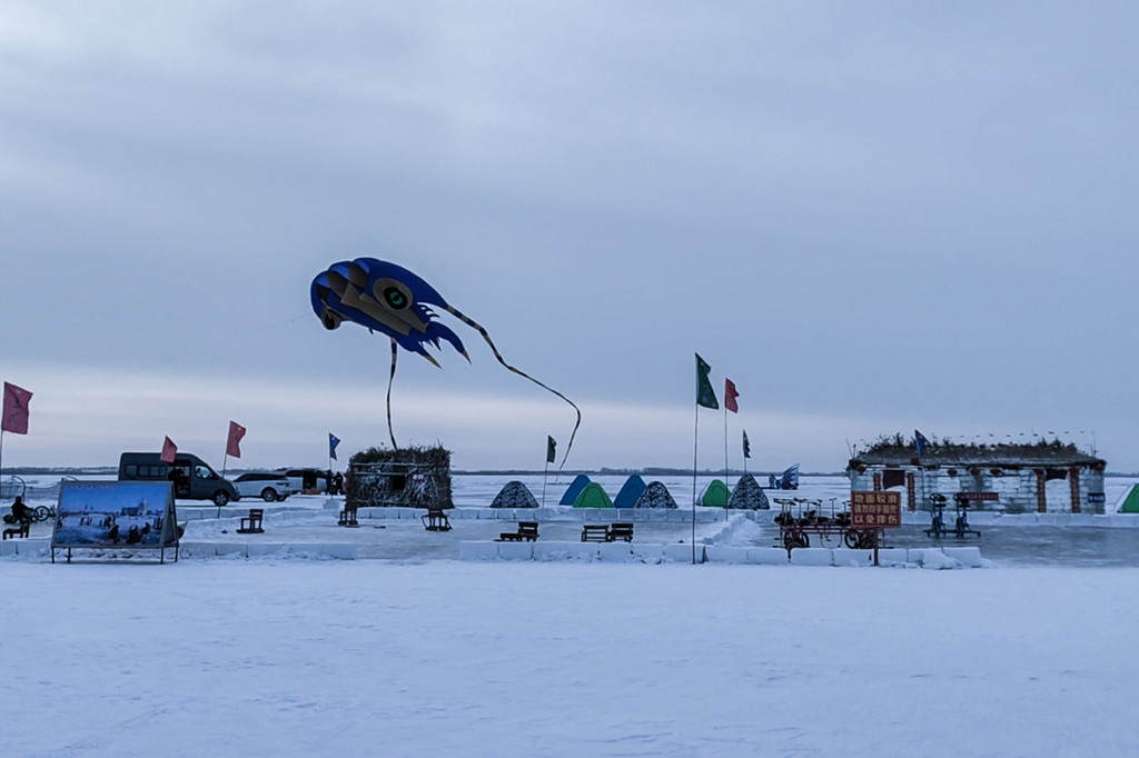 放下行李箱,直接来到酒店前可以玩冰雪娱乐的地方。远处的大风筝在车的带动下飞啊飞,湖面冰与雪的纹理和天上的蓝天融为一体。在冰与雪的世界,人真的太渺小了。