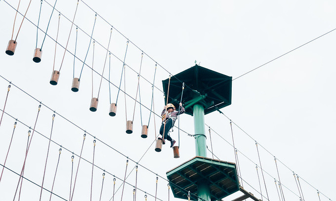 挑战分3层,一般一层一层挑战,小朋友们大多聚集在1层。这个项目会让你穿好防护衣戴好头盔,也有安全绳,所以不用担心安全的问题。
