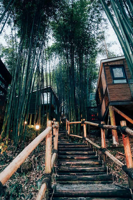 树屋大多建的比较高,顺着这样的步道向上即可到达。被竹林包裹着的房间,听着风吹竹叶声入眠,伴着虫鸣鸟叫声醒来,这种幽静的环境,怪不得周边的游客都喜欢来,也难怪古人要说“另可食无肉,不可居无竹”了。