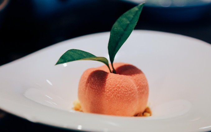 最后的甜点是特色的蜜桃慕斯。特意做了蜜桃的造型,看着真的像是一只水蜜桃呢。外层有很浓郁的蜜桃口感,内里是慕斯,冰冰凉凉的,中间还有果肉,口感层次都很丰富。对于吃完了菜,这道甜品倒是很能解腻呢。