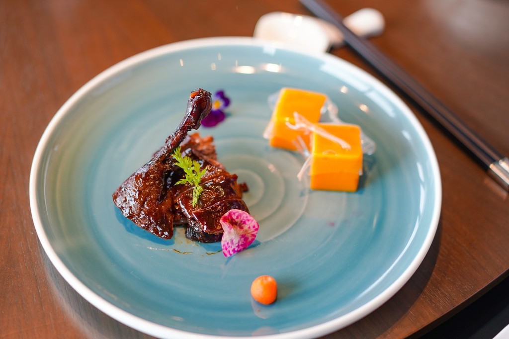(鸭子是 乐山 甜皮鸭的味道, 乐山 甜皮鸭是 四川 的名菜,多少好吃嘴周末都会专程坐动车到 乐山 去吃,而这道菜就是结合 乐山 甜皮鸭的工序,采用多种中草药、18味香料配方卤制5小时,再加以酱汁静泡24小时,让香味酱味充分进入鸭子的肉里面。)
