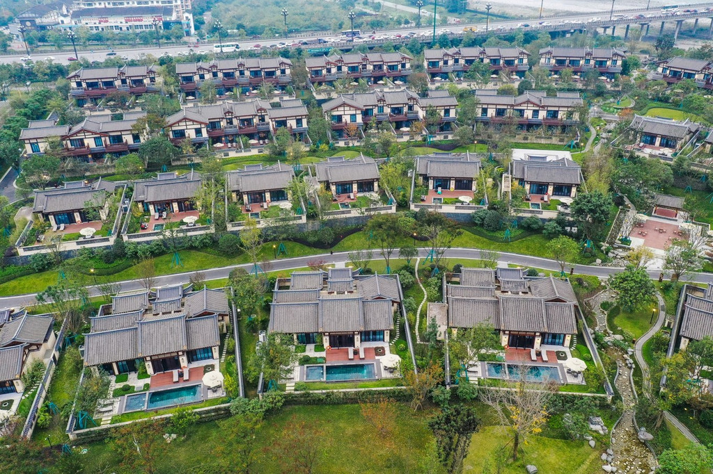 面朝长江支流“岷江流域”,黑石河从酒店群之间穿流而过,倚山傍水,自然环境得天独厚。