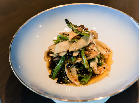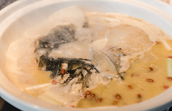 降温后的都江堰急需热菜来补,因为只有两个人,所以主厨特地根据天气为我们配上了一锅【鱼头羊肉汤】,四川人爱吃羊肉多在冬季,将羊骨和鱼头通过热油煎至两面金黄,再配上山泉水炖煮到高汤浓郁且纯白。
