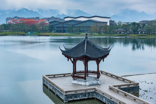 check-in的时间是私密的、也是惊喜的,大堂左右的2块木质雕刻而成的版画展现的是【拜水都江堰,问道青城山】,作品非常精美,放置在这里,也将都江堰的文化同酒店文化很好的结合在一起。大堂外正对赵公山、正所谓有山就要有水,于是酒店在建造的时候就在中间打造了一个人工湖,这一点真是颇有了我心目中都江堰的意境。