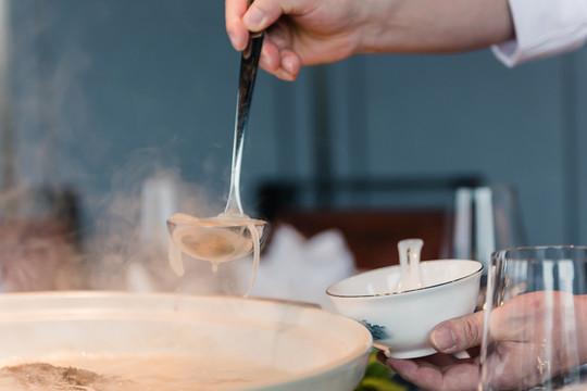 揭盖的瞬间便飘来阵阵香味。好喝的汤怎么少得了冬日里的第一把豌豆尖呢?当吃下第一口豌豆尖的时候,远处的赵公山也刚好揭开了神秘的面纱。这一切刚刚好。