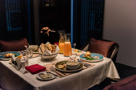 降温的青城山就是不想出门吃早饭的一天,早上睡到自然醒后听到最愉悦的声音就是服务员的送早服务,法式早餐最舒服的就是餐前先来一片法棍面包,抹上黄油,温暖的法棍烘得黄油身娇体柔。再配上brunch舒芙蕾和橙汁,情侣间的小日子就该这么慢慢惬意,缠缠绵绵。