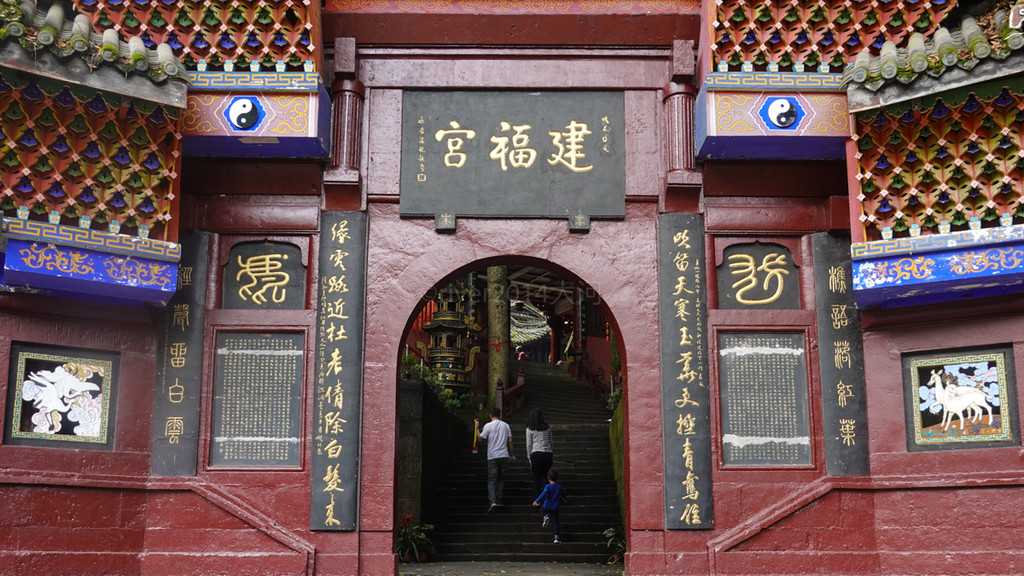 建福宫是进入青城山的第一座道观,其实还在青城山山门之外。此地传为五岳丈人宁封子修道处,该宫创建于唐代开元十二年(724),时名丈人观,宋代改名“会庆建福宫”。