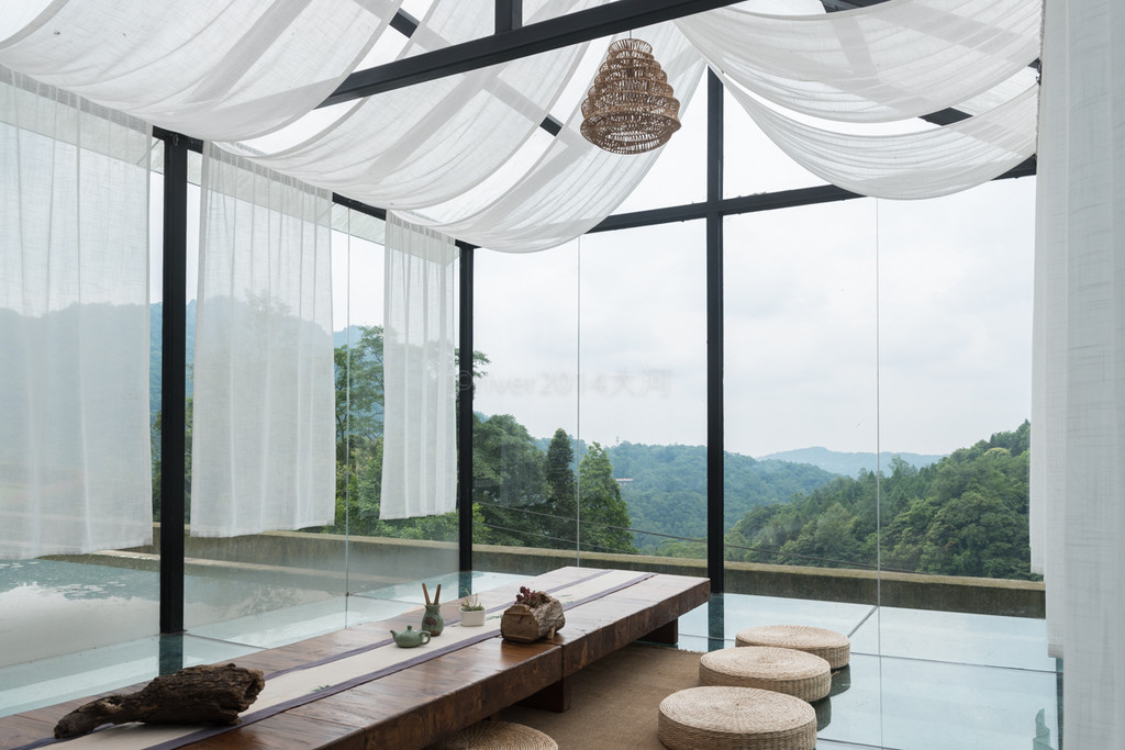 在酒店大堂对面就有一个茶室,很多客人都会被这个茶室吸引。这个茶室是透明的,四周都是玻璃,坐在这里喝茶,人与自然似乎没有隔阂,当然在这里拍照也是极美的。