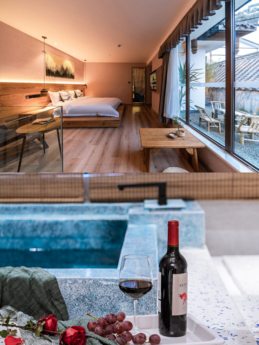 ② 静谧花园汤池 除了温泉房,小云最爱的就是观景房,推开房间有个小院,还有古镇的围墙和街道上茂密的树叶,挡住古镇的嘈杂,留下小镇的悠闲。