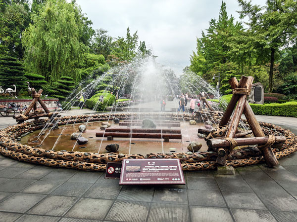 卧铁虽小,却是都江堰水利工程能够千年永续、科学运行的关键所在。因此,在离堆公园里看到仿制的卧铁,从一个侧面来说,就等于看到了都江堰千年不衰的“密码”之一。绕过卧铁喷泉之后就是堰功道,这里位于世界文化遗产都江堰景区的核心区域,是游客从离堆公园大门进入后,前往伏龙观、宝瓶口等主要景点的必经之路,是一条贯穿公园南北的中轴线步行道。