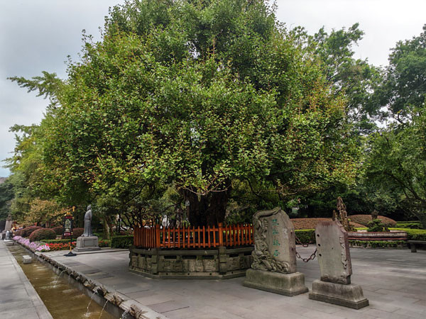 二游离堆公园,只见视野中的内亭榭错落有致,古木桩头,奇花异卉,水池喷泉,布局精巧,别具情趣,园中有紫薇花瓶,紫薇屏风,经二三百年培育而成,独具匠心;这株古银杏桩头,传说为东汉末年张松手植,至今仍亭亭玉立,枝繁叶茂,像一支仙鹤,托这里山水的灵气,听说还结出了果实。紫薇花瓶、紫薇屏风和银杏桩,人称“园中三宝”。