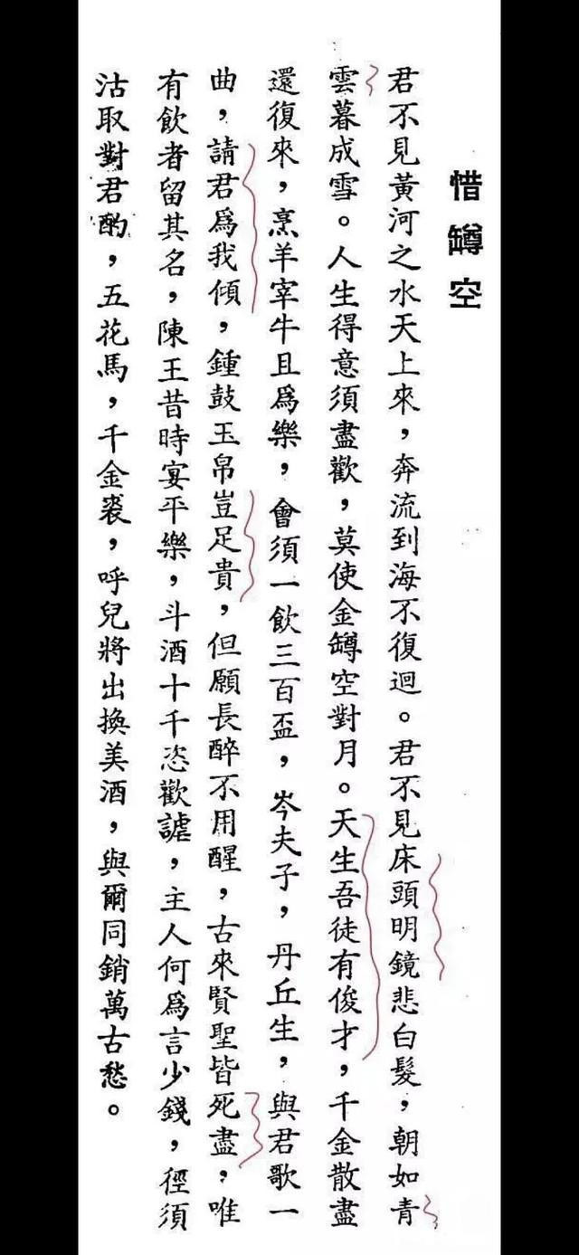 光从题目上看,“将进酒”取自诗文中有“将进酒、杯莫停”这句,有着一种劝酒之意,而“惜樽空”这个题目却折射出一个诗仙最为真实的一面:老酒鬼是绝不会劝人饮酒的,担心自己酒不够喝才是真情流露,而且“惜樽空”与后面的“径须沽取对君酌”也是十分相配。