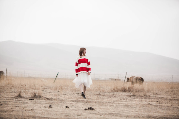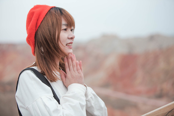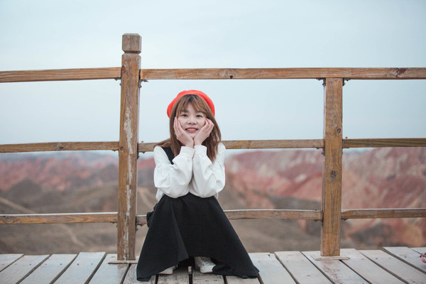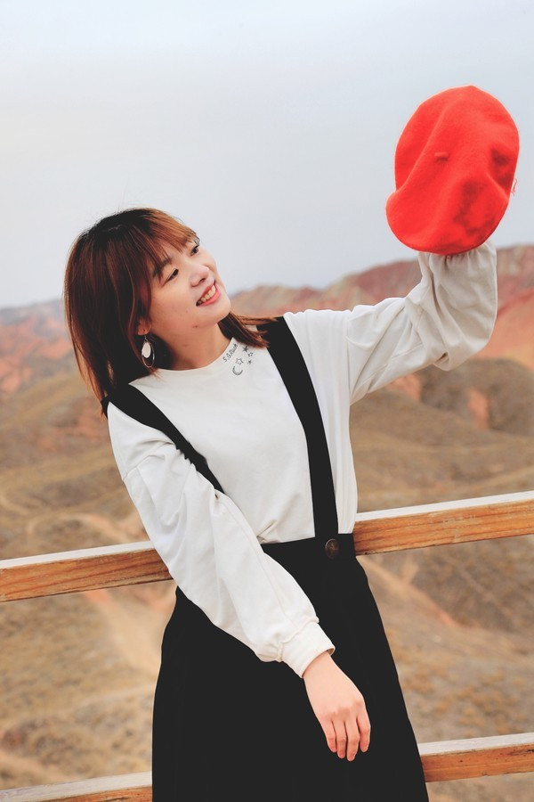 这次挑选了一个小红帽作为这套衣服的配饰。不是可以搭配,是很早以前买了一个这样的帽子,一直没用上,心想着这次有机会拿出来戴戴。倒是觉得只有黑白的着装略显单调,配上红色的帽子会显得俏皮很多。再加上比丹霞还要艳丽的红色,不知道有没有抢了丹霞的风头呢!