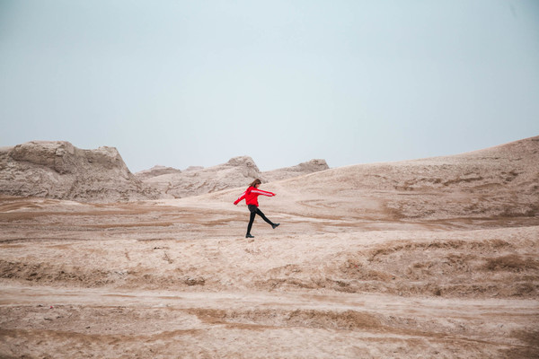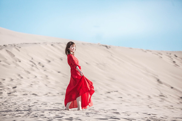 我们都知道沙漠的空旷,所以这时候最适合的就是各种挥舞的动作。拍了很多图,都是不断地转圈、玩沙子、奔跑,然后抓拍,绝对会有你满意的图片~当然,也少不了和骆驼的各种互动拍照哦!