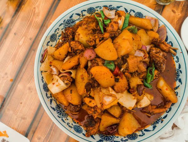 嗯,在这里你可以吃到牛羊肉的一百种吃法。可以手把羊肉、羊肉串、烤全羊、炕羊肉、羊头砂锅等,其他的还有 新疆 大盘鸡。因为牛羊肉的腥味比较重,所以做法一般以添加各种调料、偏烧烤为主,所以食客们记得要适可而止哦!