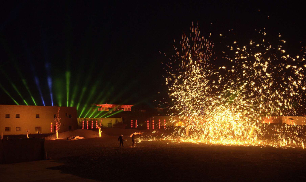 飞机到敦煌已经下午了,机场门口有直达市区的大巴,又有出租车,行李有点重,于是乎打了个出租车,到酒店大概二十分钟半个小时,选酒店是有不出意外的纠结症犯了,最后我决定选个“最”的,于是乎,我选了敦煌最独特也是最具特色的酒店--敦煌山庄。在酒店办理入住后,本着探索的心态,去酒店外面逛一逛先。走到酒店后面时,发现这里晚上刚好有一台演出,叫敦煌盛典,刚好今晚没安排,于是便买了一张票,决定晚上去看。敦煌山庄有个露台,可以再上面吃饭,还可以看到离得很近的鸣沙山,坐在这里吃着晚餐,看着远处的鸣沙山,我突然觉得我手里应该拿着一根烤羊腿,可能更加应景。吃完饭,慢悠悠的去看演出,买票的时候,要了一份简介,沙漠实景演出,看起来蛮吸引人的。嗯。。。。。。很有看头的感觉。