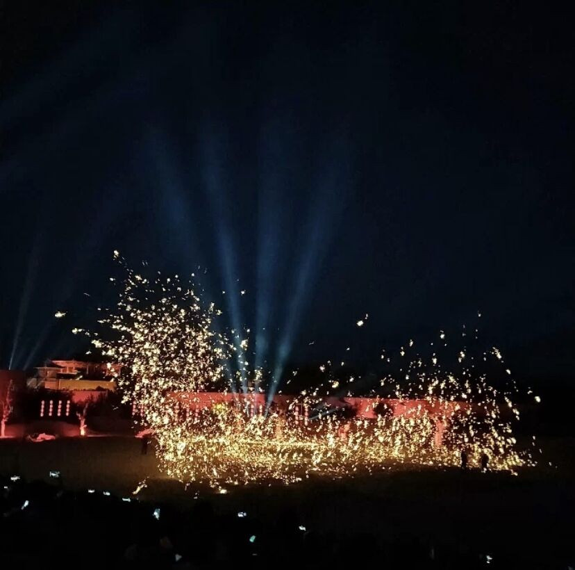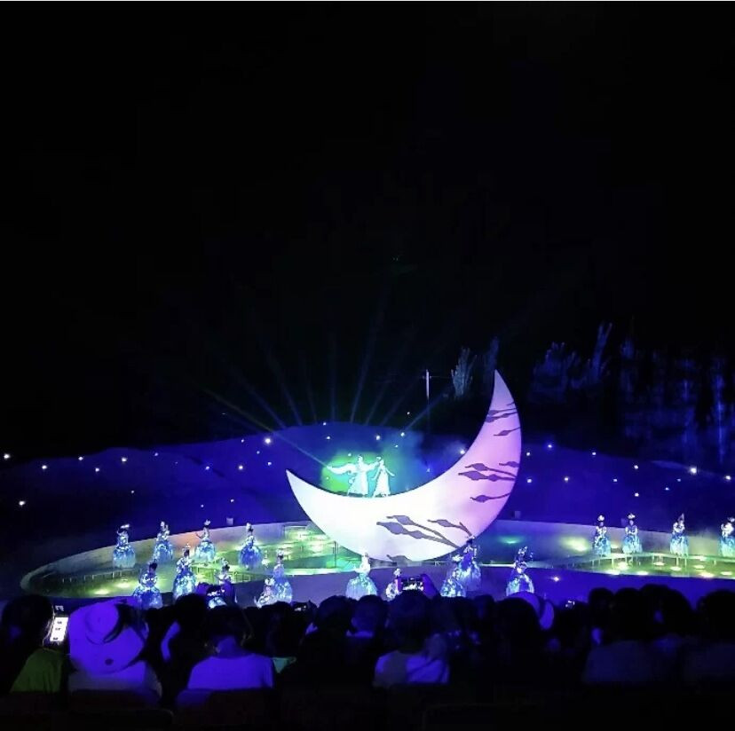 没来敦煌之前,我始终觉得敦煌是十分具有神秘色彩的一座城市,我在做关于敦煌之行的旅游功课的时候看到了《敦煌盛典》这个演出的推送,觉得十分有趣,因为本人的工作也是从事舞台剧方面的工作,所以对这个全球首台沙漠实景演出产生了非常浓厚的兴趣。传统的舞台演出是人的作品,唯有山水实景演出才是人与上帝共同的杰作,美国《纽约时报》就曾评价过山水实景演出为“中国式的山水狂想”。西北山水广袤辽阔,沙漠是西北自然身躯最主要的组成部分,《敦煌盛典》借助敦煌举世闻名的鸣沙山和月牙泉,不着痕迹地包装还原敦煌的一山一水,在回归自然,返璞归真的道路上酝酿出浓浓的敦煌味道。《敦煌盛典》背依鸣沙山地貌景观及周围的山脉走势,就在沙山脚下,那里奇峰显壑瑰丽、空中的雾岚飞烟。放眼望去,远处的鸣沙山和近处的沙丘环抱着剧场,蓝色的月泉碧波荡漾,都成为实景演出剧场的构成元素,大自然的鬼斧神工极致升华,真山真水,实景演绎一段不朽的丝路传奇,成就一个蔚为壮观的沙漠实景剧场。值得一提的是《敦煌盛典》设立了360度旋转且前后移动的观众席,与传统敦煌舞台剧相比,打破了常态化的观演和视角关系,通过观众席与舞台表演的不断旋转更替,加强了作为观众的观赏体验感受,也使我更深切地感受到属于这个舞台,属于这座城市的浪漫情怀。表演中令我最印象深刻的是表演融入了敦煌非物质文化项目“打铁花”。第一次亲眼目睹这“打铁花”的绚丽之处,在我的内心里真的给这场演出锦上添花,我想在场的观众也为之赞叹,每到“打铁花”的时候就引得观众阵阵欢呼。总之此次演出也给我的第一天敦煌之行画上了圆满的句号,来敦煌的朋友一定要去看一次壮丽恢弘的《敦煌盛典》。