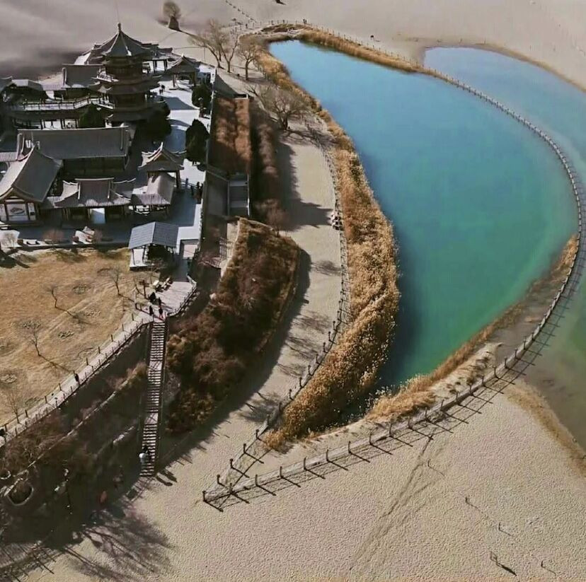 这“泉映月而无尘”、“亘古沙不填泉,泉不涸竭”的旷世奇观当我亲眼目睹的时候,也是震撼。鸣沙山和月牙泉像是大漠戈壁中一对孪生姐妹,从不知何时起一直陪伴在彼此身边,山泉共处,沙泉共生。我们去的那天正好太阳没有很毒,天气很好,吹着一丝凉风,我和朋友在之前就种草了穿一袭红裙在鸣沙山拍照的心愿,我们穿着红裙披着披肩,去拍了有百来张照片。但是朋友们来的时候太阳很毒不建议只穿裙子哦,并且一定要做好防晒,因为鸣沙山那边几乎没有什么阴凉处可以乘凉。既然到了鸣沙山,我和朋友也算是能体验的项目都体验了。什么滑沙、骑骆驼、乘沙漠越野车、滑翔伞都体验了,真的是让我这个南方人感受到了以前从未感受过的沙漠中游玩的乐趣,景区项目的价格都还算合理,如果觉得滑翔伞和乘沙漠越野车价格较贵的话,可以选择体验一下骑骆驼,骑骆驼是真的很划算,也非常值得一试,以前没有骑过骆驼,最开始骑的时候还闹了点小笑话,还好拉骆驼的小哥哥耐心地教了我怎么做。不过确实拉骆驼的小哥哥也十分辛苦,领走前我和朋友分别给了他一些小费,也希望能够给他一点微不足道的力量吧。因为晚上九点要去看预定了的敦煌盛典演出,所以我和朋友很遗憾没有能赶得上看鸣沙山的日落,这实在是有点遗憾,不过我和朋友对此次的游玩还是非常充实和满意的,我个人觉得如果各位来时间不赶的话还是要目睹一下沙漠日落或日出的景象的。也可以将游玩的日程提到早上看日出,下午参观莫高窟也是非常不错的选择。最后如果要拍摄月牙泉的照片,欣赏或拍摄月牙泉有两个最好的角度:一是爬上沙山顶,俯瞰月牙泉;二是近距离的平视月牙泉。