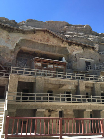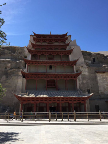 我们此次敦煌行的第一站,当然是向往已久的莫高窟了,莫高窟附近全部是沙漠和戈壁。莫高窟俗称千佛洞,是世界上规模最大、内容最丰富、保存最完整的佛教石窟寺庙遗址之一。闻名于全世界,国内外人都来看敦煌莫高窟,提起莫高窟,我们最先想到的就是那些美轮美奂的壁画和佛像了。走进莫高窟景区,就可以看到无数个大小不一的石窟,很像蜂房,就这样密密麻麻的排列在山岩峭壁上。莫高窟共有九层,还修了长长的栈道,方便游客参观。