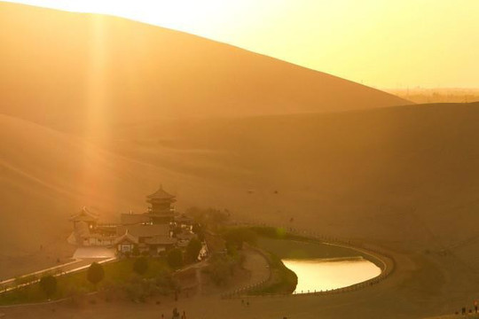 随着太阳的落山,光线开始变得柔和起来,月牙泉里的水也变成了一面金色的镜子,在沙子上走起来也没有那么烫脚了