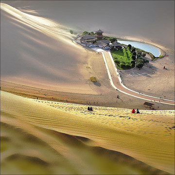 匆匆参观完莫高窟,下午,便来到了沙漠中的绿洲————月牙泉。在没来到敦煌之前,以前我常常觉得,敦煌是一个无垠大漠覆盖的城市,城市都在沙漠之中,因为之前认识一个敦煌人他告诉我,他们那边上学上班都是骑着骆驼上的,哈哈!!!到了敦煌才知道,原来他是骗我的,别拦着我我一定回去手撕了他。它不像我去过的任何一个城市。敦煌有的不只是印象中广阔无边的沙漠、美妙绝伦的壁画,这里没有漫天的雾霾,有的只是空气中夹杂着来自沙漠的五色沙。不过真的好热呀!尤其是月牙泉中那个夫妻柳,看着它的简介真的是触动到了我的心弦,真的好真实,好感人啊!尤其是那沙漠中的泉干旱不枯竭,让我惊叹,大自然的奇观啊!