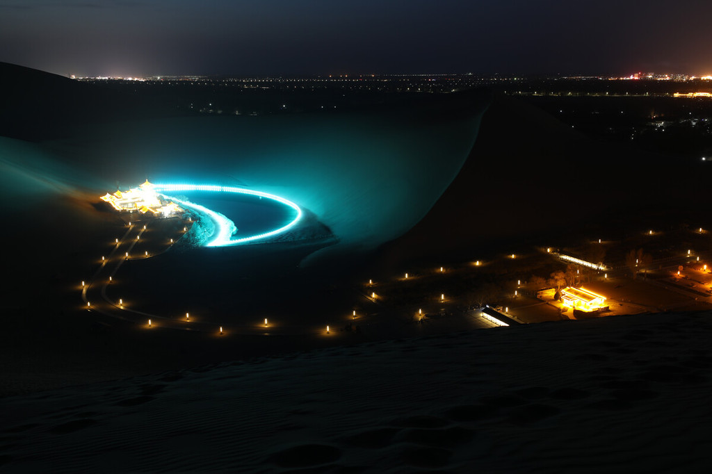 第四站是敦煌城,走在街上突然看到敦煌盛典的牌子,突然让我很是好奇,想去看一看,原来这个节目是以鸣沙山下的沙漠为背景的舞台剧,演员们在沙漠上演出,这真是一个奇思妙想的好想法,这就是它的亮点,敦煌盛典的配乐气势雄浑,演员的表演很专业,有很多莫高窟飞天的角色,能把人一下子带入那个敦煌文化的元素里面。让我真的是想为他竖起大拇指来。