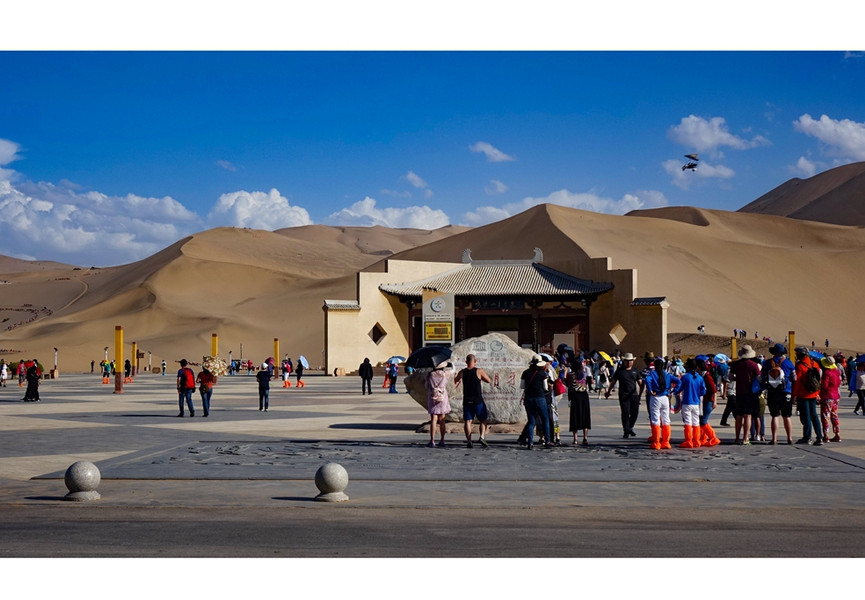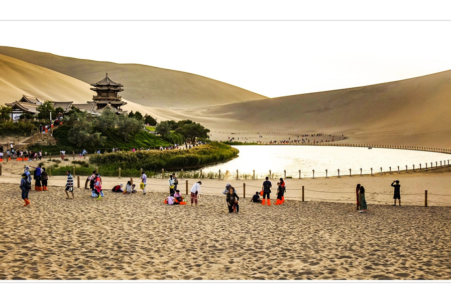 鸣沙山位于敦煌市南五公里。沙峰起伏,人们顺坡滑落,便会发出轰鸣声,称为“沙岭晴鸣”,为敦煌八景之一。鸣沙山长40公里、宽20公里,最高处约 250米,全山积沙而成。山峰陡峭,背如刀刃,山麓有翡翠般的月牙泉一湾清泉,涟漪萦回,碧如翡翠,自汉朝起即为“敦煌八景”之一,得名“月泉晓彻”。历代文人学士对这一独特的山泉地貌、沙漠奇观称赞不已。有诗云:“晴空万里蔚兰天,美绝人寰月牙泉,银山四面沙环抱,一池清水绿漪涟”。月牙泉,梦一般的谜,千百年来不为流沙而淹没,不因干旱而枯竭。在茫茫大漠中有此一泉,在黑风黄沙中有此一水,在满目荒凉中有此一景,深得天地之韵律,造化之神奇,令人神醉情驰。