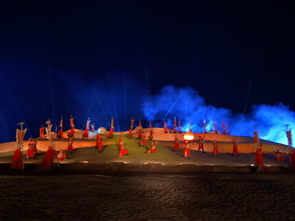 灯光打开的一瞬间,伴随鼓声响起,风沙吹动,当时的心情是真不愧是实景演出,那一刻,我是比较兴奋地。敦煌盛典在户外以沙漠实景为背景演出的,月夜星空成为正常演出的一部分,人与自然完美交融,展现古敦煌的繁华盛况。观众席是三百六十度旋转的前后移动的观众席,观看打铁花,人在洞窟,体验跨越时空表演,深入了解莫高窟文化。看完敦煌盛典让我深度感受茫茫大漠的沧桑。把敦煌的历史文化展现的出神入化,个人特别喜欢。