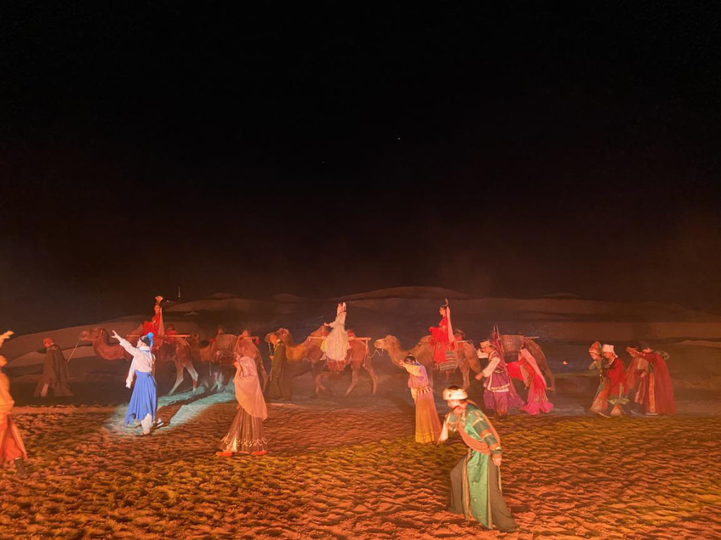 这绝对是一场光与影的盛宴!实景和华丽舞美相映成趣,包裹式的洞窟,如梦似幻的舞台效果,让人目不暇接!这样的实景剧场,生平还是第一次领略,来看《敦煌盛典》就对了!这么近距离地感受舞台,将一切收入眼底。如此的大型沙漠实景演出,360度旋转座椅随着剧情起伏不定,随手一拍,就是一副明艳不可方物的绚丽图景,心中是前所未有的激动澎湃。用这种方式去直观地感受敦煌,感受莫高窟的魅力,简直是美到窒息了!华丽的舞美设计和实景舞台效果相得益彰,演员将拓枝舞的美展现得淋漓尽致,柘枝舞来自西域的石国,进而传入中原,石国又名柘枝,拓枝舞由此得名。演员们身穿独具特色的民族服饰,在鼓声当中出场,舞袖时而低垂,时而翘起,“长袖入华裀”不过如此景象,将观众带回那一段让人难忘的岁月当中。