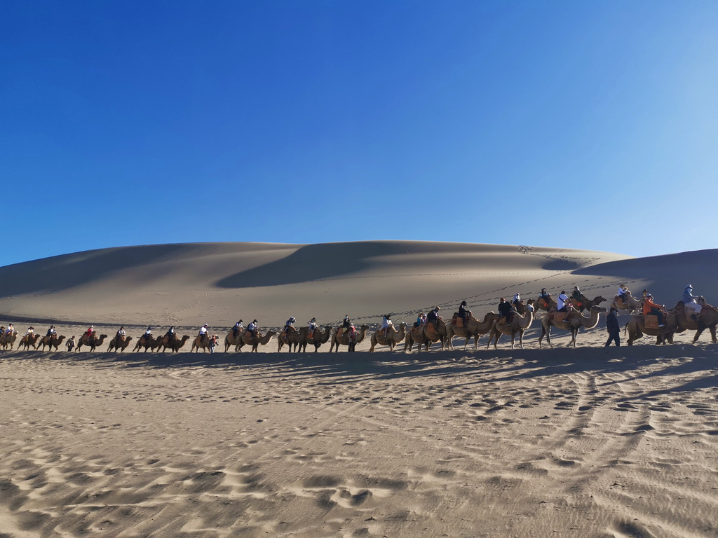 驼队伴随着驼铃声,沿着沙丘的楞边慢慢向前,首尾距离好长好长。