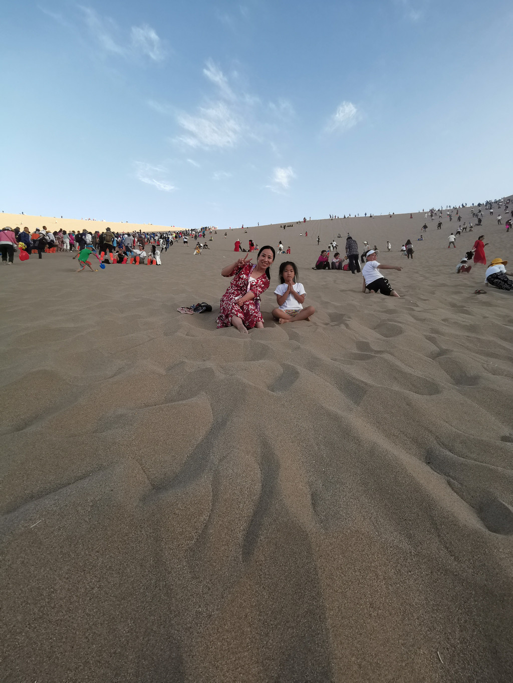 月牙泉的水今年好像显得有点对,围栏线外都有一些溢了出来,满满和几个刚认识的小朋友在月牙泉边堆沙堡,不许大人从上边经过;我和满满妈妈坐着等了一会过后,决定带着满满爬背后的鸣沙山,顺便挑战一下从中间直接爬。