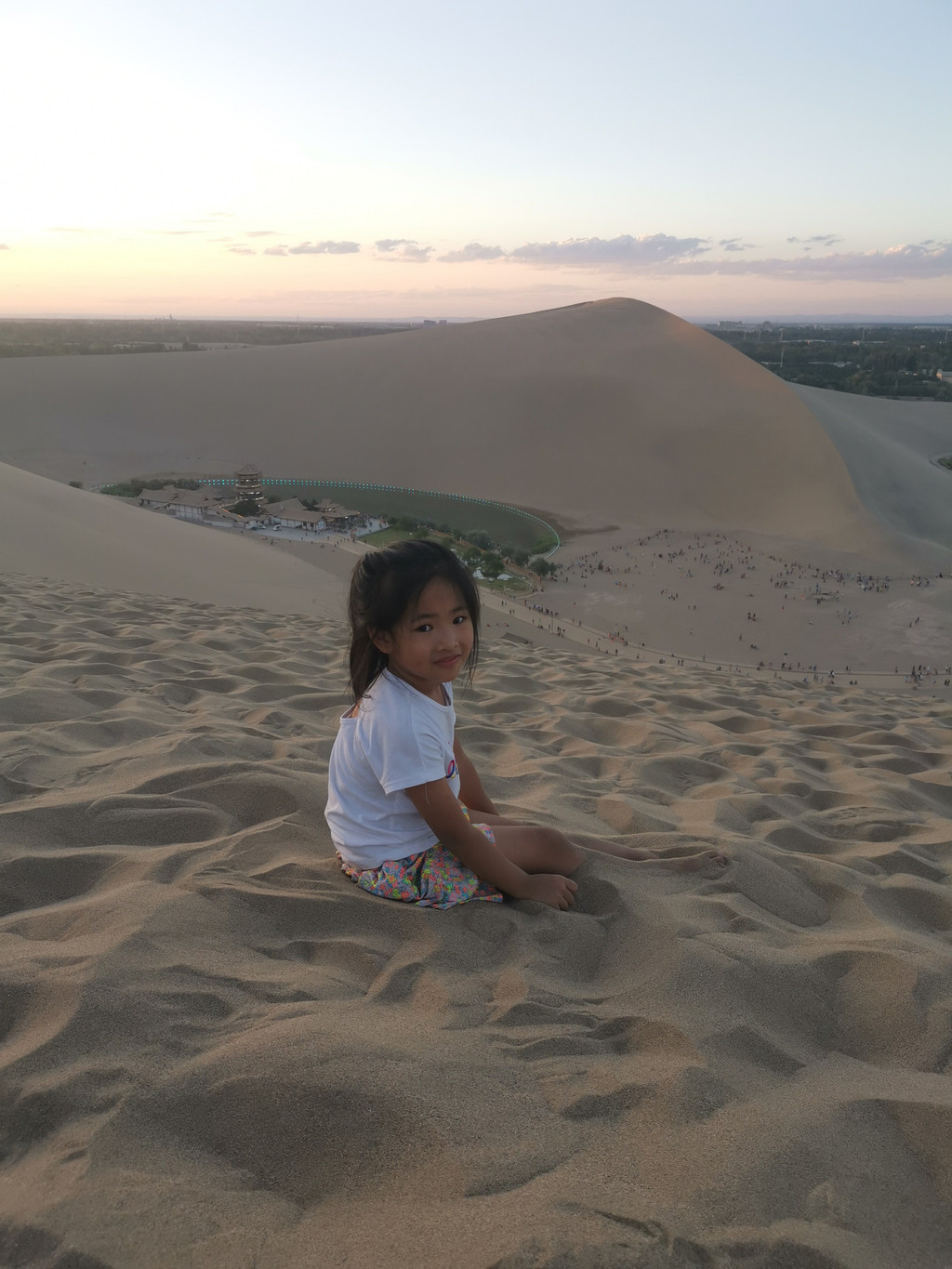 比赛结果是满满第一、妈妈敏敏第二、爸爸最后。坐在山顶往下看鸣沙山和月牙泉,伴随着夕阳的在天边映出的一抹红,眼前的景色已经持续了几千年!若干年以后,还会有人继续坐在这里,看夕阳!