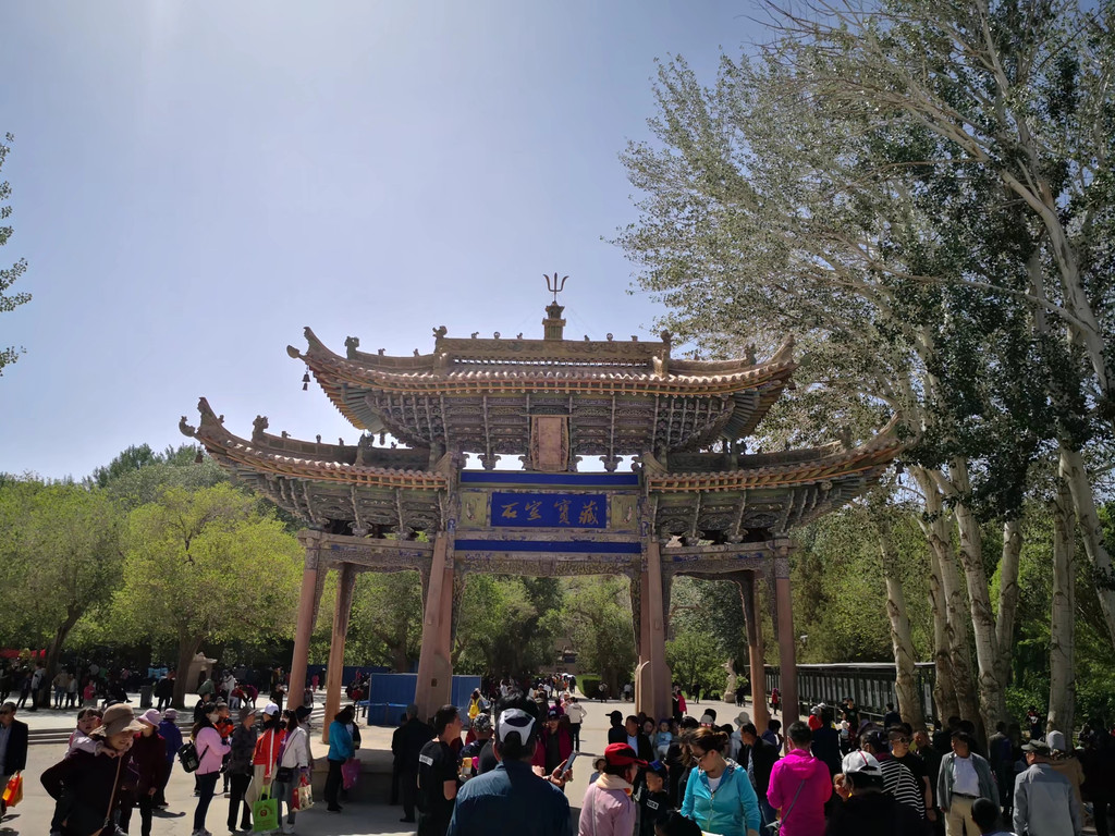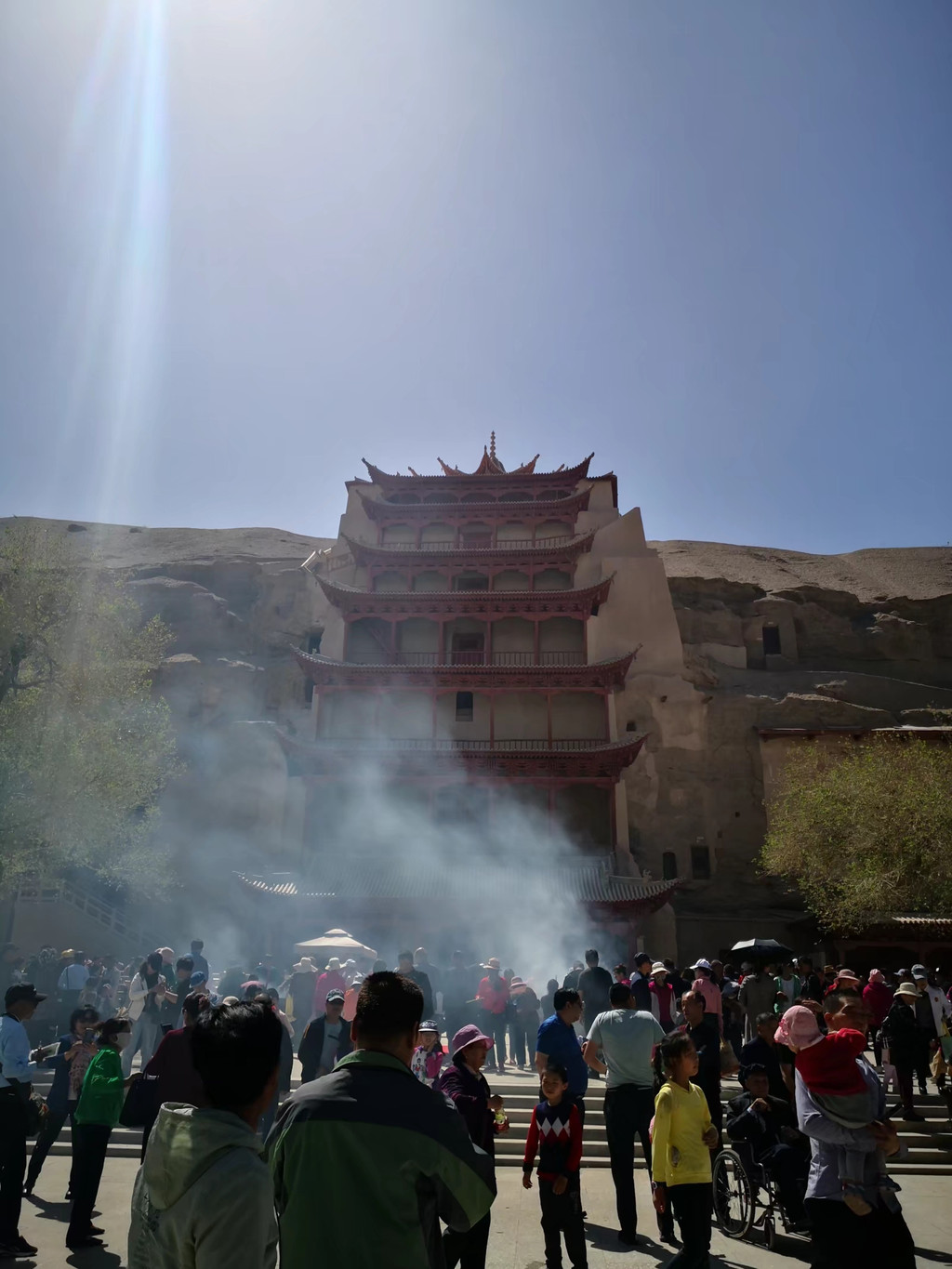 非常幸运的是我们千载难逢的“邂逅”了敦煌莫高窟2019年"浴佛节",原来每年农历四月初八是汉传佛教浴佛节,这一天是佛祖释迦牟尼的诞辰日,又称佛诞日、佛诞节等。这一天敦煌当地民众携家带口早早前往莫高窟标志性建筑“九层楼”前烧香礼佛、祈福幸福。为了满足本地居民礼佛的传统习俗,敦煌研究院为当地居民推出5元/人的礼佛门票,可参观第96窟(大佛殿)、第138窟(娘娘殿)、第148窟(卧佛殿),并被破例允许在景区护栏外围烧香拜佛,窟前还有唱大戏、扭秧歌等民俗表演活动,人头攒动,热闹非凡。