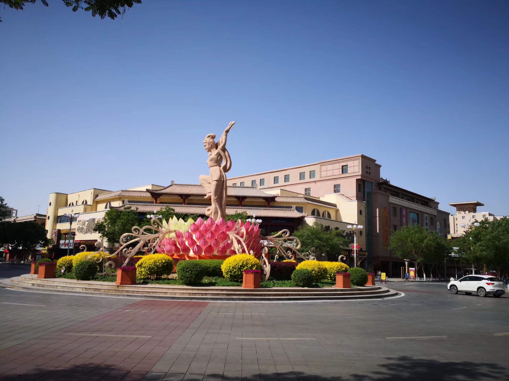步行几分钟都到了市中心的地方,天气非常好,见到了传说中的飞天雕像。每到一个城市只要时间允许,我们多数会选择步行,漫无目的的穿街走巷,一定要混入当地人的行列,这样既省了车马费,也可以深入体验当地风土人情。我们在一个小巷子里吃了一碗牛肉面、两个包子,味道还行吧。查了一下莫高窟参观咨询预约售票中心很近,也就1公里左右,于是我们沿着阳关东路一直往东,过了敦煌宾馆不远,马路对面就是,途中碰到敦煌市2019年5.12“防灾减灾日”集中宣传活动,硬生生的被市民了一把,发了资料让我们学习、签名,估计也被拍照了。