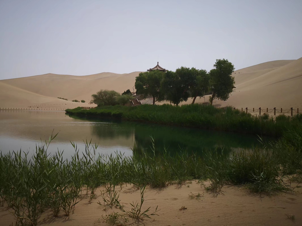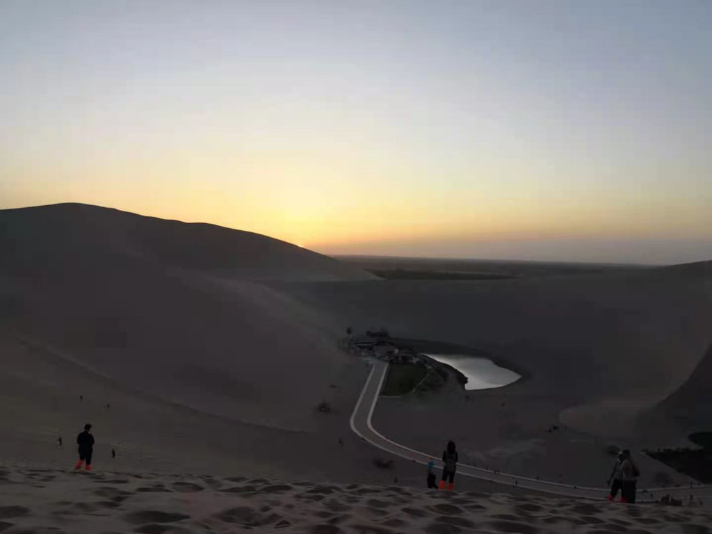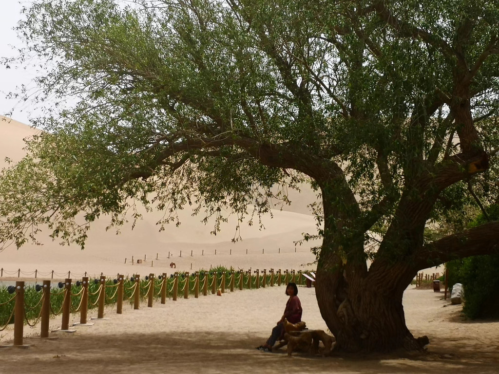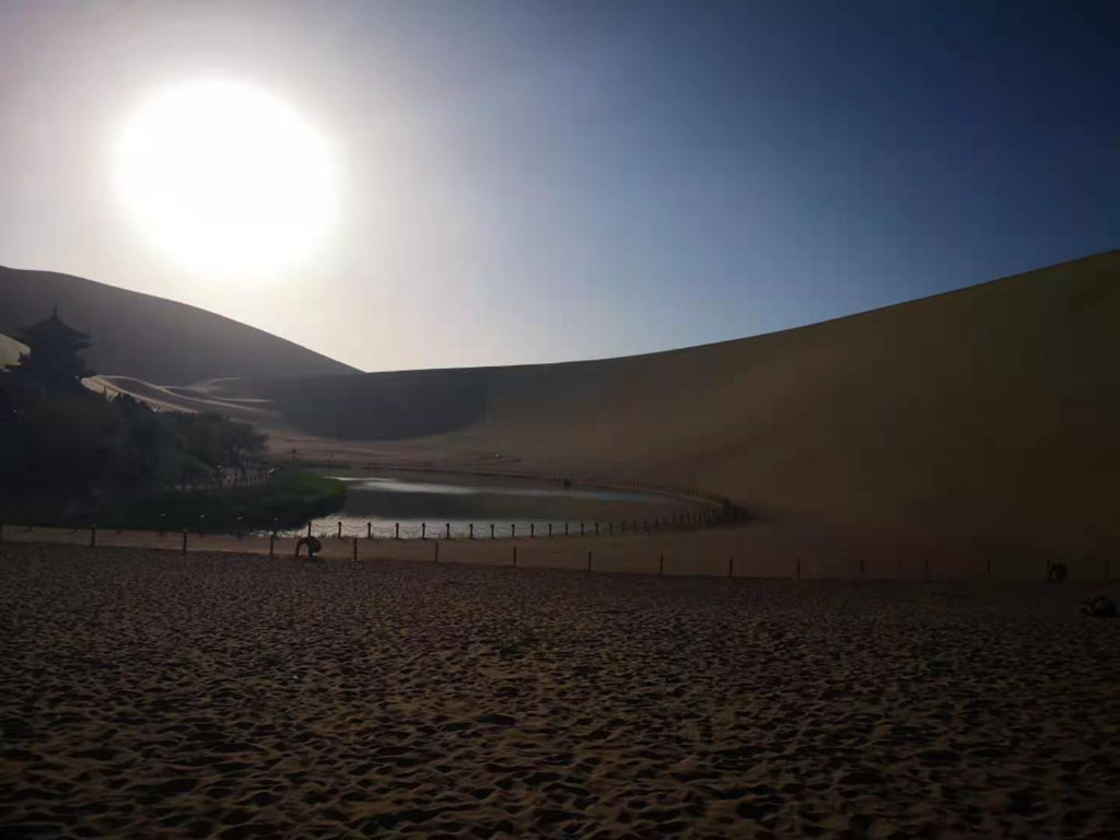 今天是下午的航班,我和女儿一商量,再去鸣沙山-月牙泉,她想坐滑翔机,我想再看早晨的鸣沙山-月牙泉。 昨天只顾着往高处爬,今天我想近距离的感受月牙泉,品品思乡愁。