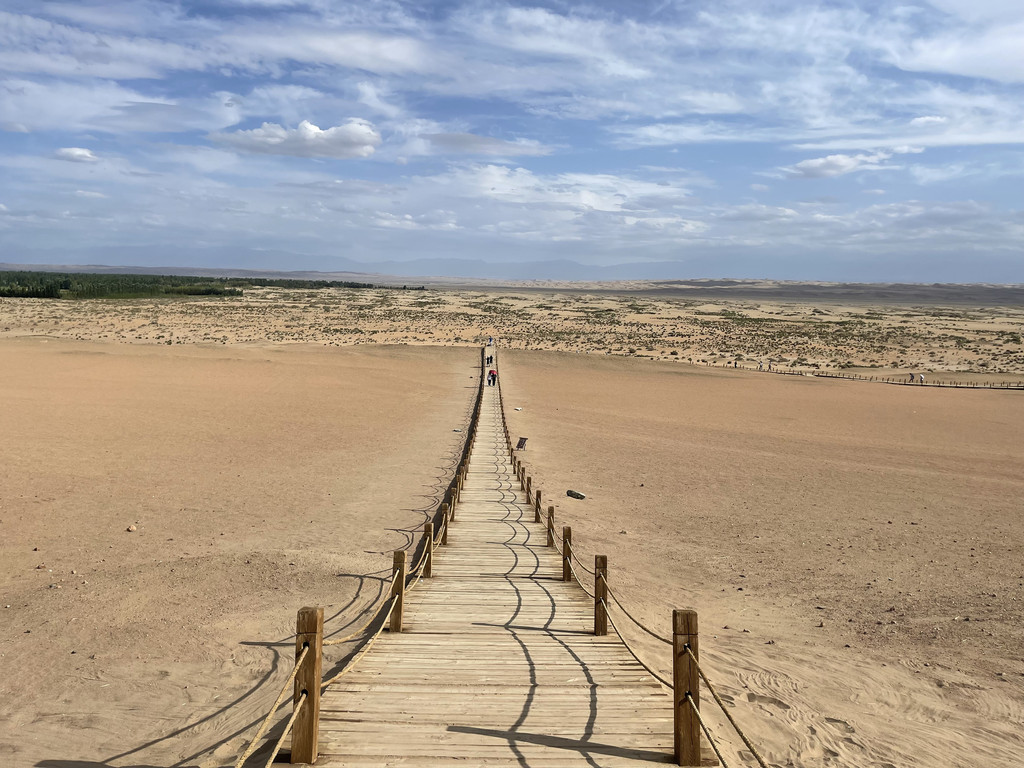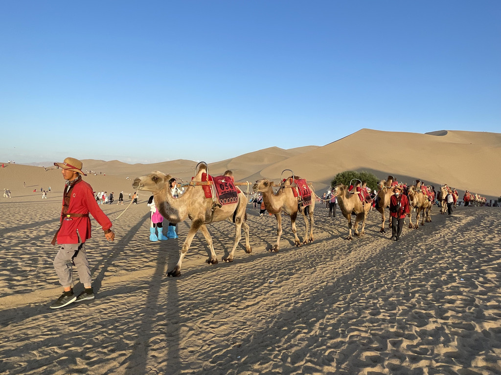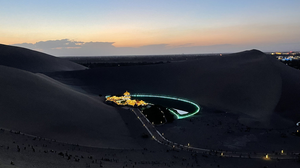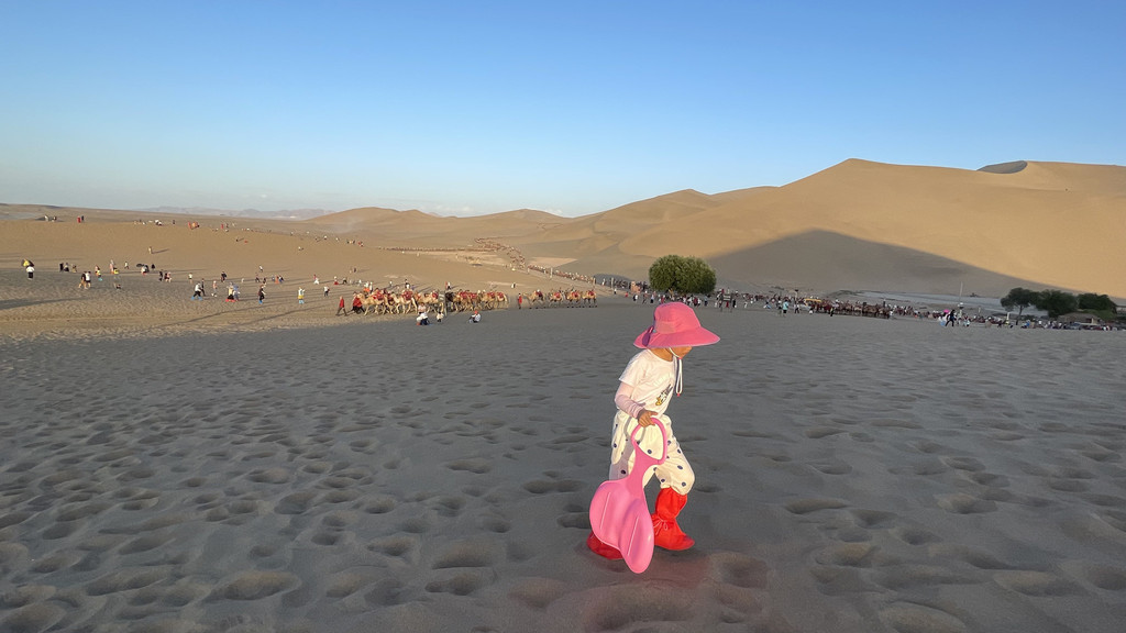 晴空万里蔚蓝天,美绝人寰月牙泉,银山四面沙环抱,一池清水绿漪涟。鸣沙山——月牙泉景区,以“山泉共处,沙水共生”的奇妙景观著称于世,被誉为“塞外风光之一绝”。我们莫高窟结束回酒店修整后,晚上8点多才出门,赶在20:30之前进入景区。此刻正赶上落日,但已经来不及爬上山顶,那就先玩滑沙吧,不管是海边的还是沙漠的沙子,小朋友们总是没有抵抗力的。哈哈,根本不用担心坡有多斜,滑沙比想象中的难滑,塑料滑沙板就是凑个热闹的。等人潮退去,天黑之前,我们爬上了鸣沙山顶,等待夜幕降临,躺平看星星。满天繁星,意外地偶遇了两颗流星一闪而过,赶紧许愿,^_^。要不是娃们“妈妈、妈妈”的呼叫声,感觉整个世界只剩下我自己和漫天繁星了。题外话:像我们在鸣沙山上凌晨12:30才回酒店,完全可以考虑去沙漠露营,估计会更好玩。但此次考虑到安全因素,留待下次啦。
