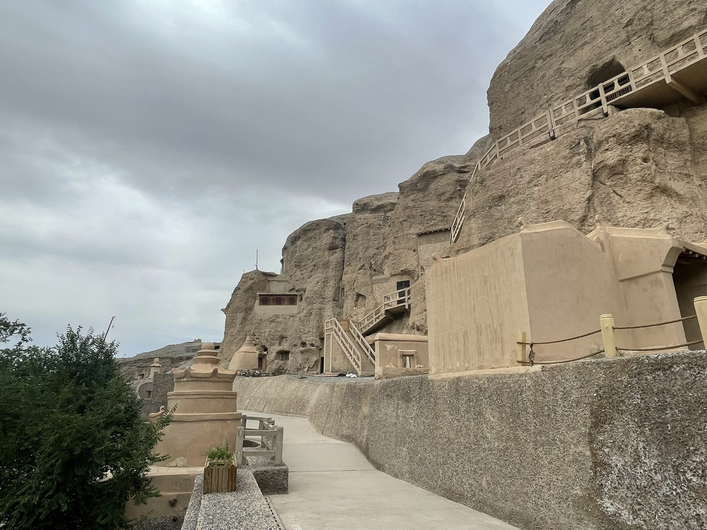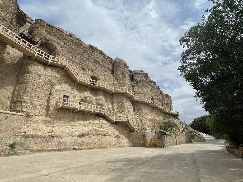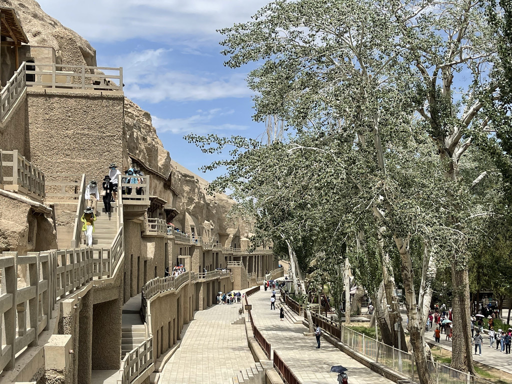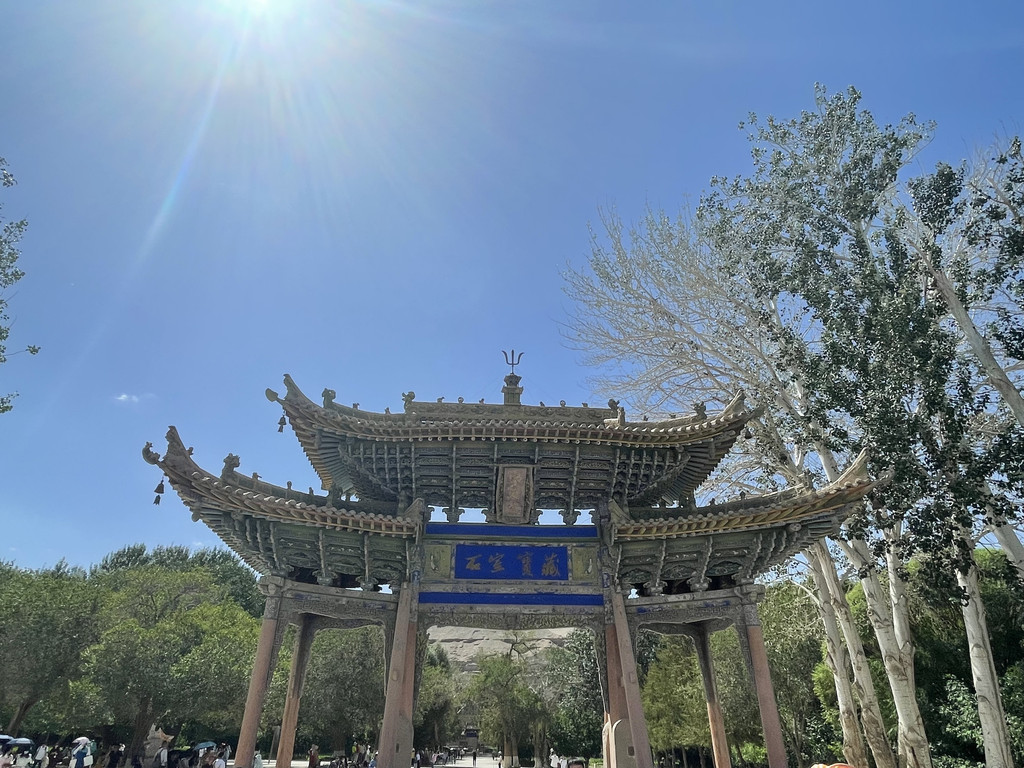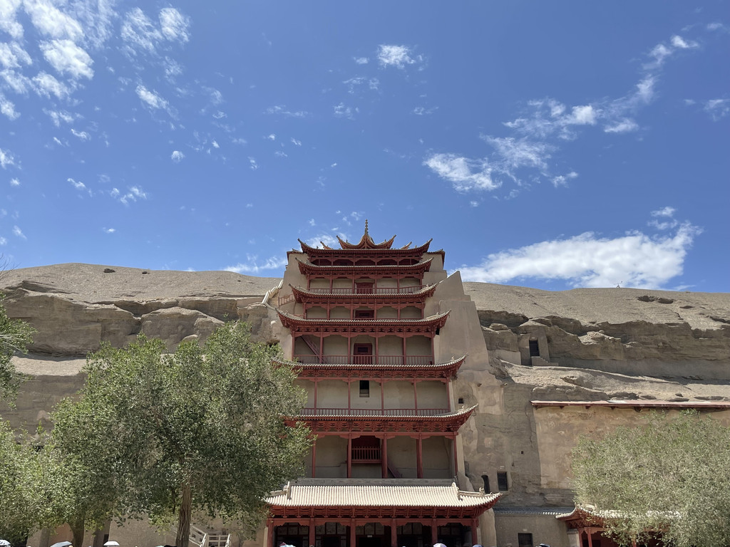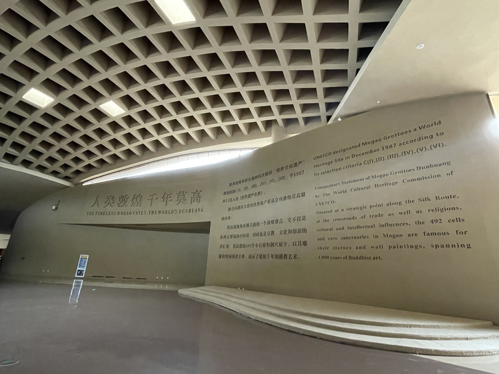没有约到一早的莫高窟,约了12:15的莫高窟,焉知非福呢?!在《又见敦煌》里身临其境地了解了千年敦煌后,上午又抽空去了趟敦煌博物馆,除了了解敦煌历史,里面有个复制的莫高窟第45窟,和敦煌遗书。也算是为下午的莫高窟做个铺垫,或许对那些日渐失了颜色的壁画上的人物和故事,有些许真切的感受,感受敦煌饱满厚重的历史,和石窟光彩辉煌的曾经。
