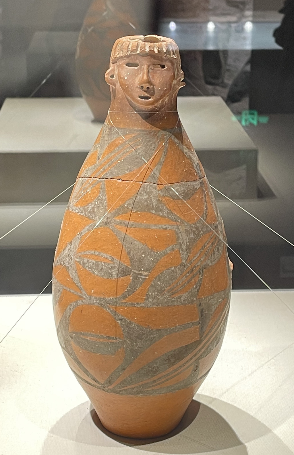 人头形器口彩陶瓶,高32.3厘米,细泥红陶质地,绘有黑彩纹饰。人头型器口雕刻生动,前额齐眉、向后披发及颈,梳理得十分整齐;挺鼻小嘴,五官端正,双耳还有系挂饰物的小孔,宛若穿着花衣的少女。这种发式和形象在相当广阔的古羌人地区具有普遍性,反映出了新石器时期原始人的头面装饰。