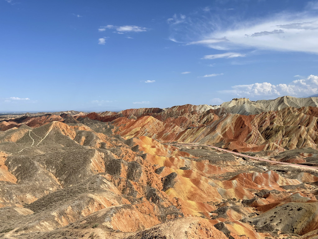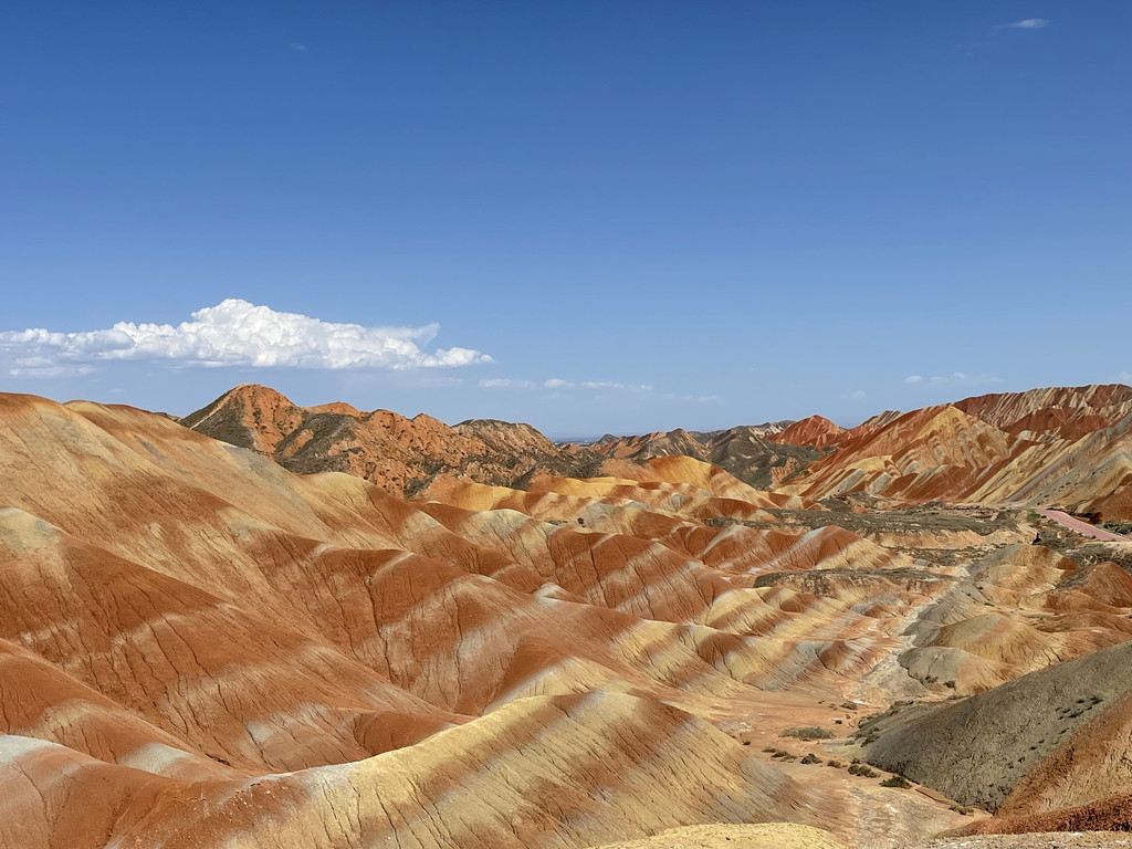 大名鼎鼎的张掖丹霞地质公园,地处祁连山北麓,距离张掖城区1个小时左右车程,是中国丹霞地貌发育最大最好、地貌造型最丰富的地区之—,为“中国最美的七大丹霞”之—。 我们大中午的抵达丹霞,太晒了,乘坐景区接驳车,没做更多停留,四个观景台,我们只在1号和4号下车看了会,属于到此一游啦,最后在出口那里看了会影片,了解了七彩丹霞是怎么被一位摄影师无意中被发现的,而丹霞最美的色彩是在落日时分和雨后。