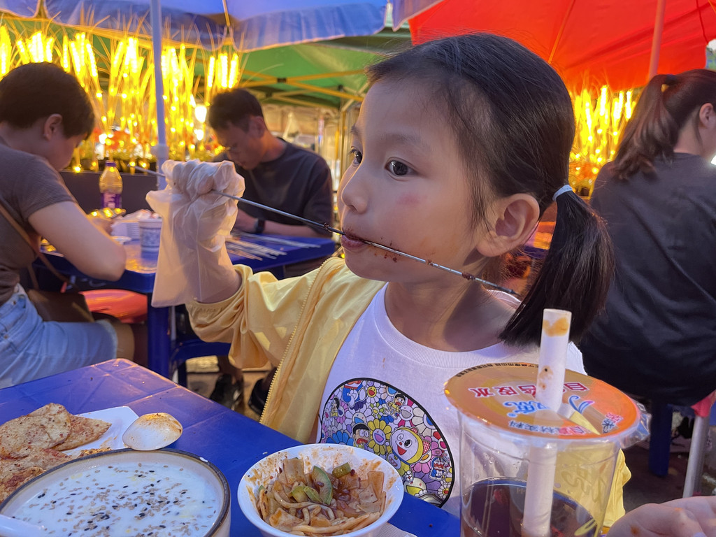 抵达嘉峪关,入住嘉峪关宾馆(关城丝绸之路文化博览园店)。宾馆网评老旧,300不到的价格,心里也没啥期待,不料前台小姐姐默默地给升级到套房了,把俩娃乐得。修整后,步行至嘉峪关夜市,大概10来分钟吧。吃了老董烤串,我后来又去8号面馆来了一份面,量太多,剩好多。