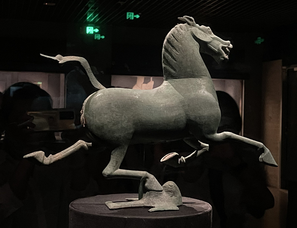 铜奔马,1969年出土于甘肃省武威市雷台汉墓,一经问世便惊艳四座。它通高34.5厘米,长45厘米,宽13.1厘米,重7.3千克。铜奔马躯体壮实,集西域马和蒙古马等马种的优点于一身,还特别表现出了河西特种良马经过训练后的“对侧步”特征。