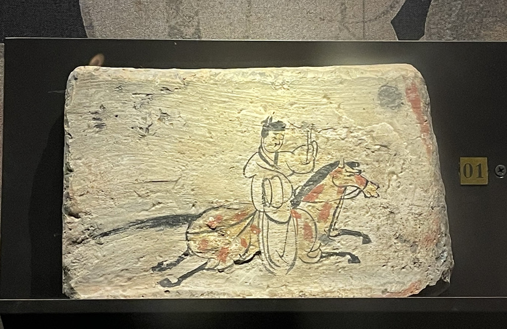 驿使图画像砖,于1972年出土自嘉峪关新城堡魏晋墓群。它长34厘米,宽17厘米,米黄色的砖石上,寥寥数笔,就传神地刻画出1600多年前西北边疆的邮驿情形。一名驿使头戴黑帻,身穿右襟宽袖衣,神情肃穆,稳坐马背。他一手紧控缰绳,一手举示棨传文书,砖上特意没有画出他的嘴,据说是为了表明昔日驿传的守口如瓶。