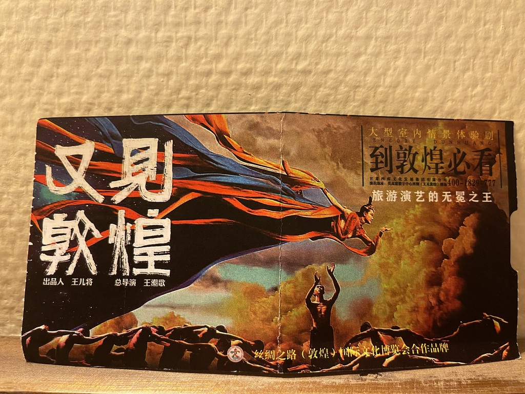 晚上安排了《又见敦煌》,大型室内情景剧,分为四个场景,著名导演王潮歌亲临创作。“一千年有多长?不过一瞬间。一瞬间,春一去,冬一来,一千年就过去啦。”不剧透,还是现场感受吧。坐席买普通席就好了,我们有幸坐到至尊席后面一排,而前面一排又没人空着,超级至尊享受啦。