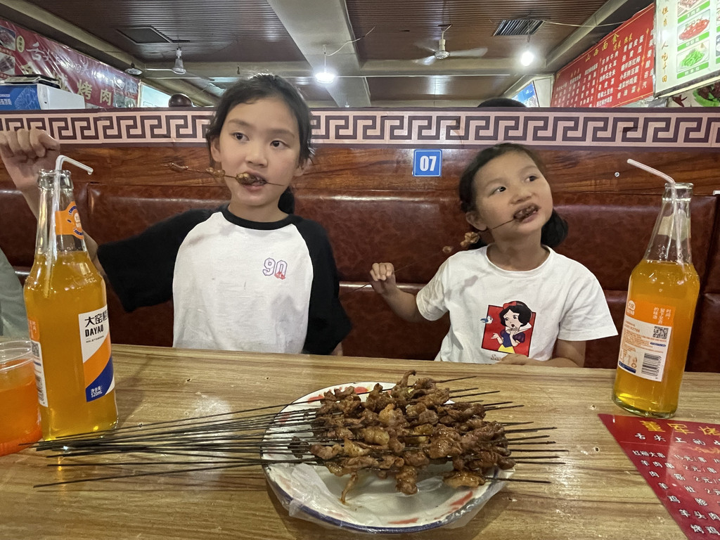 晚上第一顿正餐,找了正宁路小吃夜市上的清真有奴思嘉峪关烤肉店,娃们期待的烤串安排上。。。