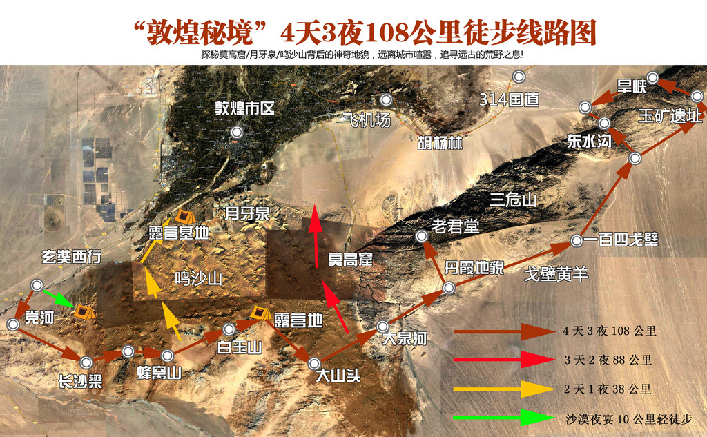 4天3夜108公里徒步线路:起点为玄奘西行雕像-党河峡谷-长沙梁-黑山-白石头-大泉河-140戈壁-东水沟-旱峡。