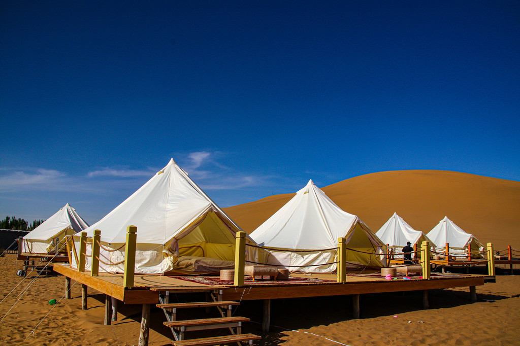 十月份来敦煌,可以说是金风玉露,秋高气爽,晚上沙漠露营是不冷的。敦煌真正变冷到十一月中旬左右,每年冬天11.1敦煌才开始供暖气。十月敦煌夜晚的最低温度在零度以上,由于温差比较大,白天气温要高一些,大约在15-20度左右。一般露营基地都有厚被子,如果感觉比较冷的话,可以和露营基地工作人员联系,增加被子或睡袋。相比夏季,秋季晚上要冷一些,露营衣物要穿厚一些,最好是薄羽绒服或者是棉外套。