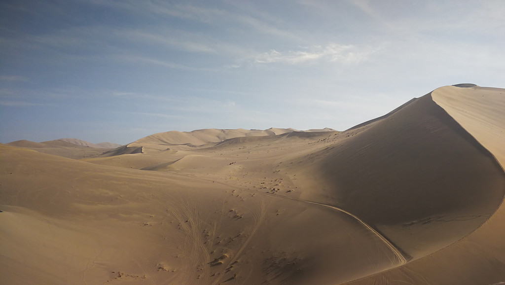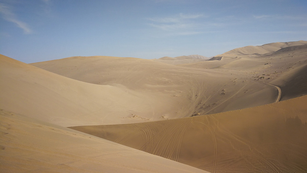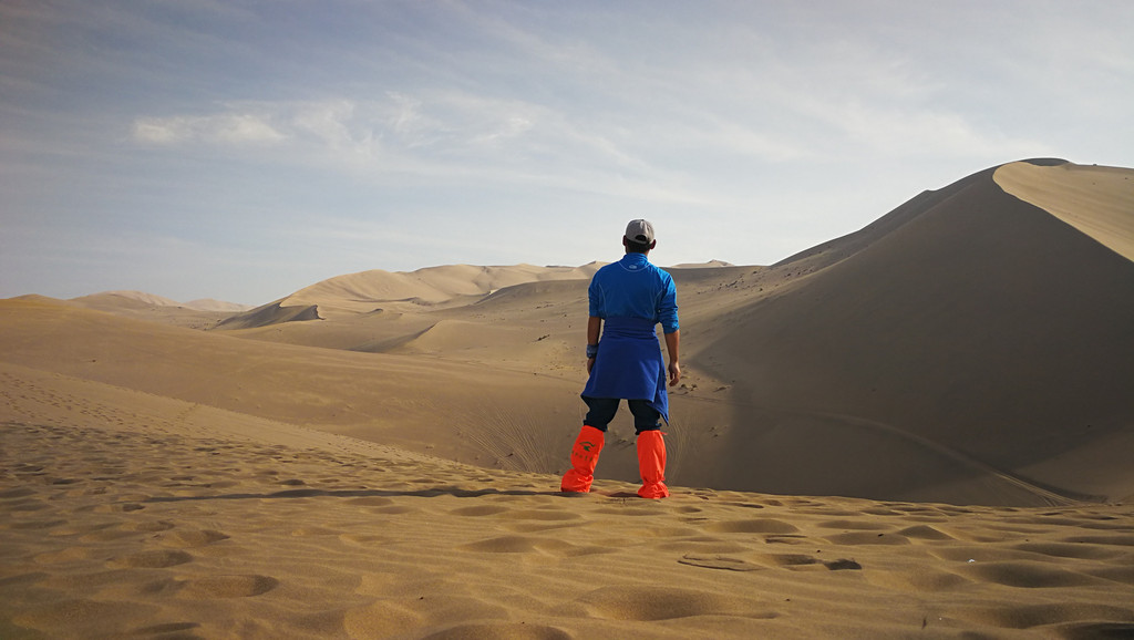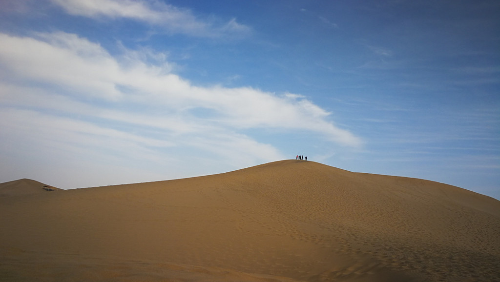 天气也非常的好,晴空万里,蓝天白云下,一片苍黄之色,沙丘如同波浪一般连绵不绝地向着远方蔓延着,我站在一个沙丘之巅,眺望着看不到尽头的远方,激动,兴奋中还夹杂着一丝的遗憾,为何时至今日,我才方能领落到苍茫大漠的壮丽姿色,这些年一路漂泊,在不断的追求,也在不断的错过!